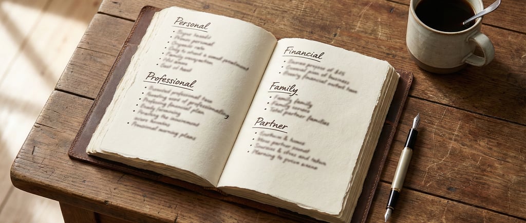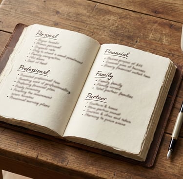 I start at the beginning of a week identifying a potential list—the things I think I want. I get a large piece of paper. I divide it into columns with headings: personal, professional, financial, family, partner—and ask quietly.